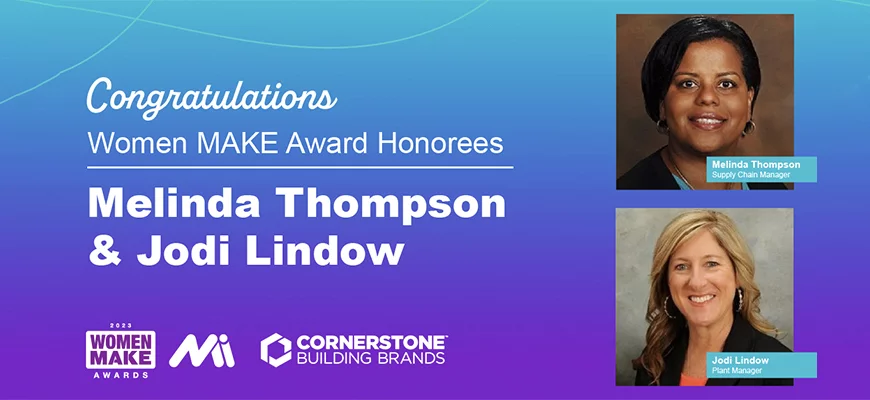 Cornerstone Building Brands, the largest manufacturer of exterior building products in North America, is proud to announce that Melinda Thompson, supply chain and logistics manager in North Brunswick, N.J., and Jodi Lindow, plant manager in Walbridge, Ohio, have been selected to receive the 2023 Women MAKE Award from The Manufacturing Institute.